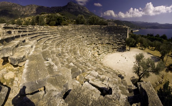 The old name of the Antiphellos on which Kaş district center is set up on today, is mentioned as Habesos in the inscriptions in Lycian and on some coins. The city is known to have existed since 6th century B.C. had become a little settlement as the port of Phellos which is located just above it. However upon entering in Hellenistic period, Phellos declined and Antiphellos grew and become more important. This situation went on in the Roman period and the city was developed due to the cedar tree trade from the forests in the area and sponge fishing and became a rich city growing out of being just a port of Phellos and later became one of the members of Lycian League. Ancient city is located partly under current city and partly located on the peninsula lies in east-west direction. Hellenistic parapet remains which contain rectangular stone masonry workmanship on them can be seen at the section where the peninsula starts, from the side overlooking Meis Island and at seaside. The theatre overlooking the sea of the Antiphellos near the road reaching to Çukurbağ Peninsula has been preserved very well until today. Theater is located in a relatively higher place with its 26 seating rows and beautiful stone masonry work and has the typical Hellenistic theatre properties but it does not have a stage building.